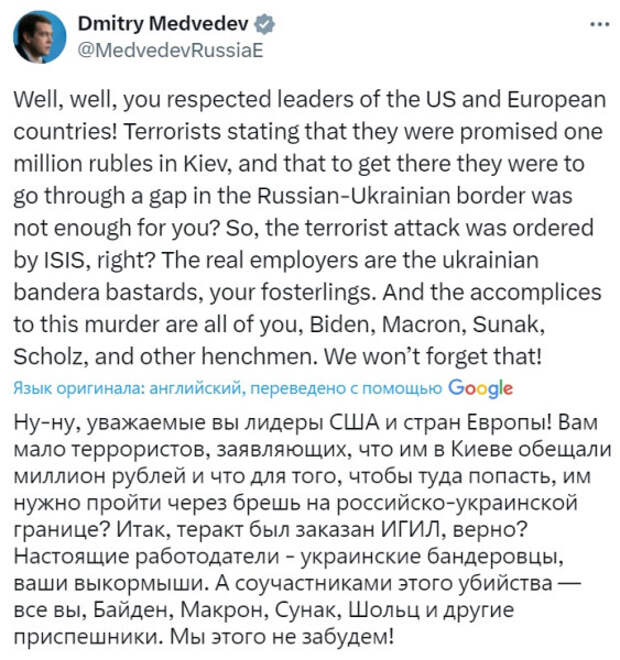 "Ну что же, уважаемые лидеры США и европейских стран! Заявлений террористов о том, что в Киеве им пообещали миллион рублей и что для того, чтобы попасть туда, они должны были пройти через окно на российско-украинской границе, вам недостаточно? Теракт был заказан ИГИЛ**, не так ли? Реальные заказчики — это украинские бандеровские подонки, ваши выкормыши. А соучастники этого убийства — все вы, Байден, Макрон, Сунак, Шольц и другие подельники. Мы этого не забудем", - написал заместитель председателя Совета Безопасности России, первый зампред Военно-промышленной комиссии РФ Дмитрий Медведев на английском в соцсети X.